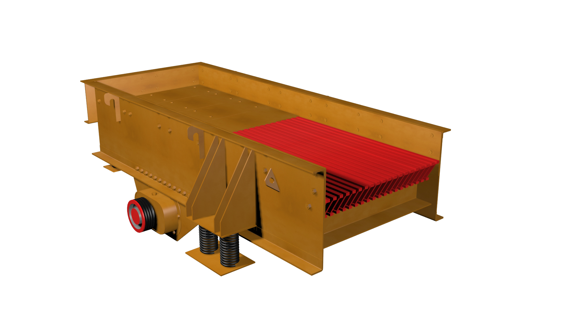 振動(dòng)給料機(jī)是由給料槽體、激振器、彈簧支座、傳動(dòng)裝置等組成。槽體振動(dòng)給料的振動(dòng)源是激振器。激振器是由兩根偏心軸(主、被動(dòng))和齒輪副組成,由電動(dòng)機(jī)通過三角帶驅(qū)動(dòng)主動(dòng)軸,再由主動(dòng)軸上齒輪嚙合被動(dòng)軸轉(zhuǎn)動(dòng)。主、被動(dòng)軸同時(shí)反向旋轉(zhuǎn),使槽體振動(dòng),使物料連續(xù)不斷流動(dòng),達(dá)到輸送物料的目的。